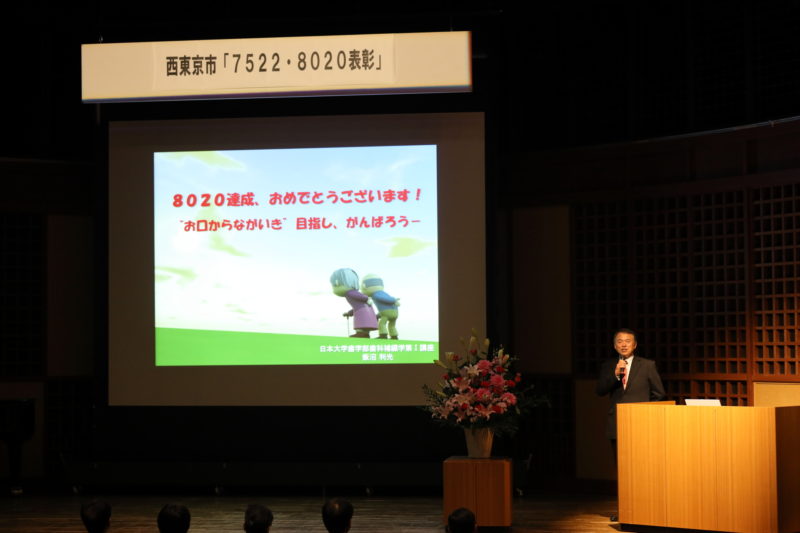 平成30年11月18日(日)午前10時より保谷こもれびホール小ホールにて「西東京市7522・8020表彰」式典が開催されました。当日は穏やかな秋晴れに恵まれ、会場には表彰対象者と付き添いの方を合わせ約120名の方々にお越しいただき、表彰式とともに日本大学飯沼利光教授による講演「「8020達成、おめでとうございます!“お口からながいき“目指し、がんばろうー」、さらに声楽家による歌、ピアノの演奏で有意義な時間を楽しんでいただけたようです。