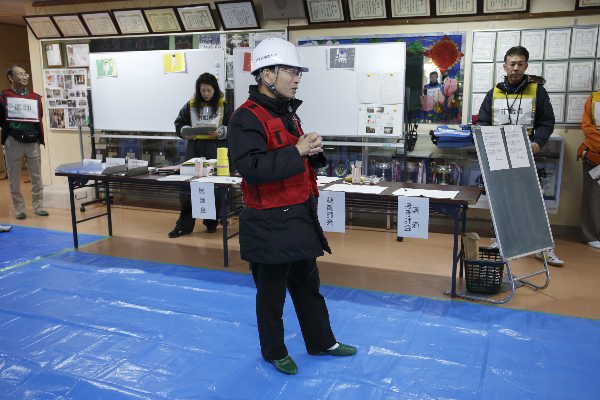 トリアージタッグが付けられた患者さんは、黄色の中等度処置室や、赤の重症者処置室に移動しますが、普段は中学校の木工室・金工室の机に毛布を敷いた程度。そこで薬剤師さんが軽症者、医師は中等度以上の患者さんの処置をします。