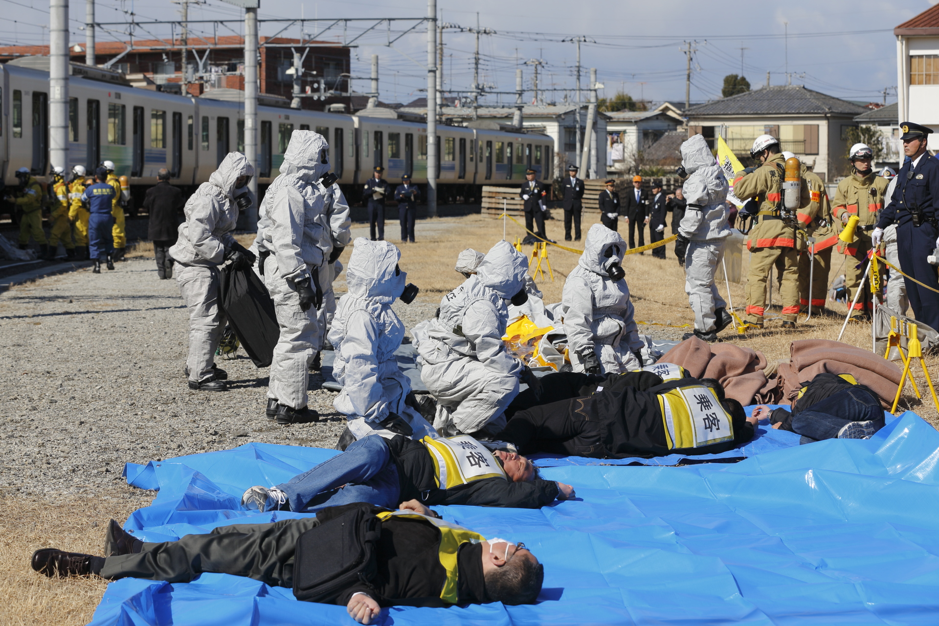 設定は、西武池袋線保谷駅停車中の電車内で、気分が悪くなったり倒れたりした乗客が発生、事態に対応しつつ、紙袋から漏れたサリンによるテロと断定、乗客避難や、薬液除去、除染という一連の対応の訓練でした。